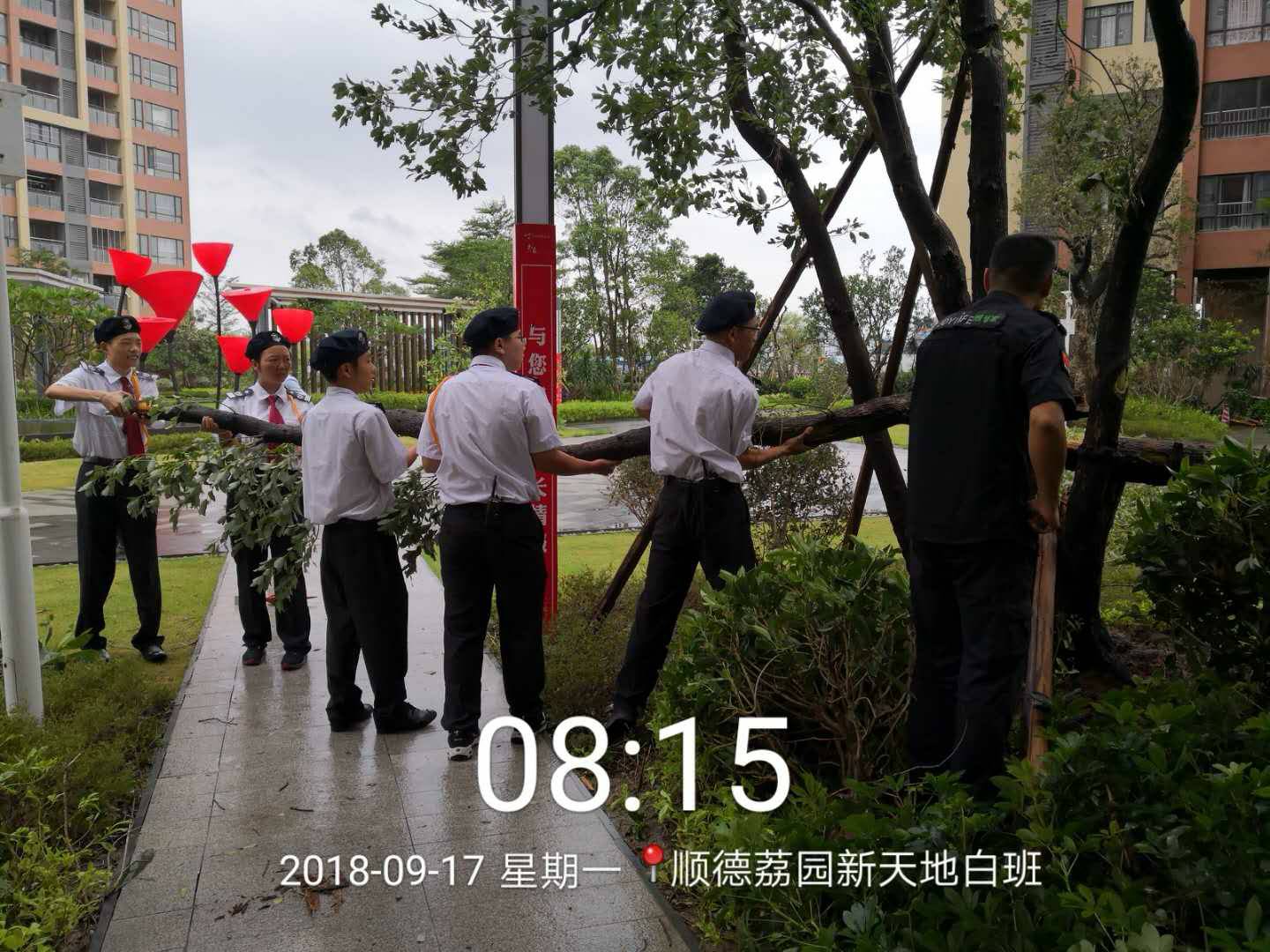 安保和后勤的值守工作人员,冒着风雨抢险救灾,保证交通顺畅,狂风中,他们迎风而上, 不怕脏不怕累,众志成城,任功任怨的羊城安保精神,值得表扬!